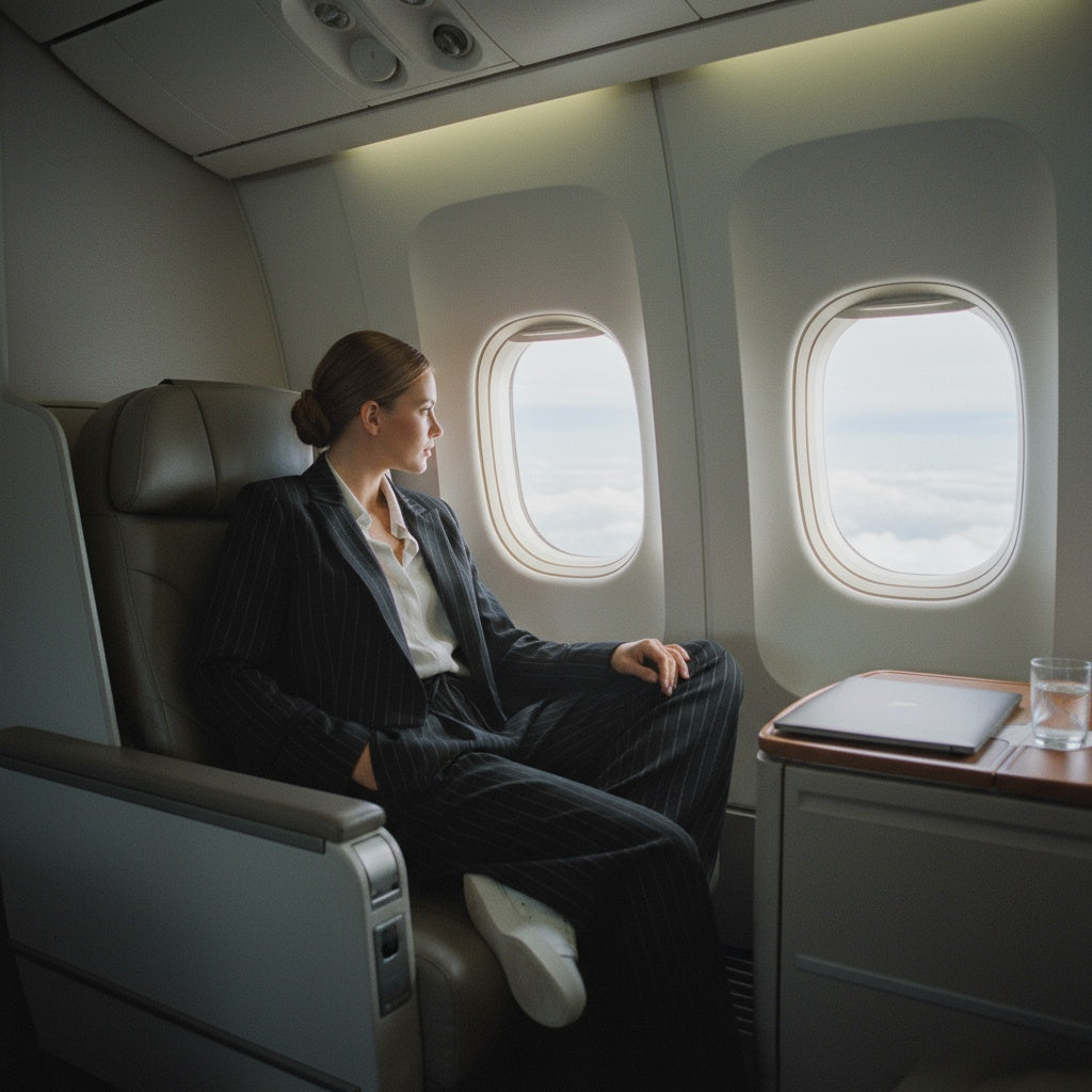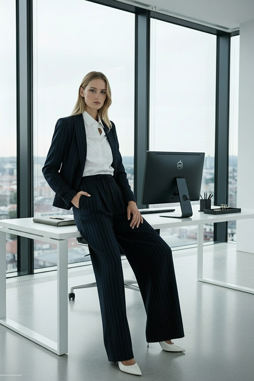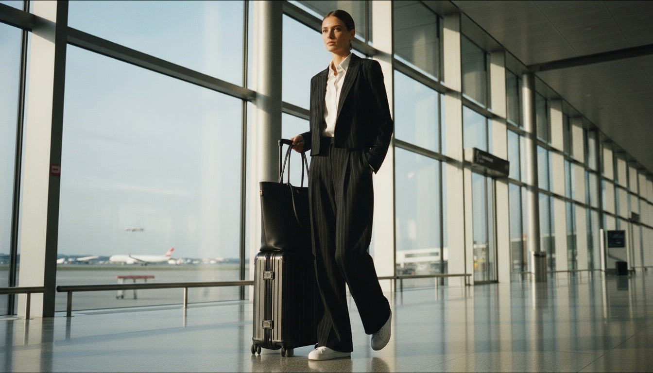 Whether you're stepping through the airport, leading a meeting, or settling into a late evening over your laptop, the ensemble stays composed. It frames the wearer rather than overwhelming her, allowing her presence - not her outfit - to take center stage.